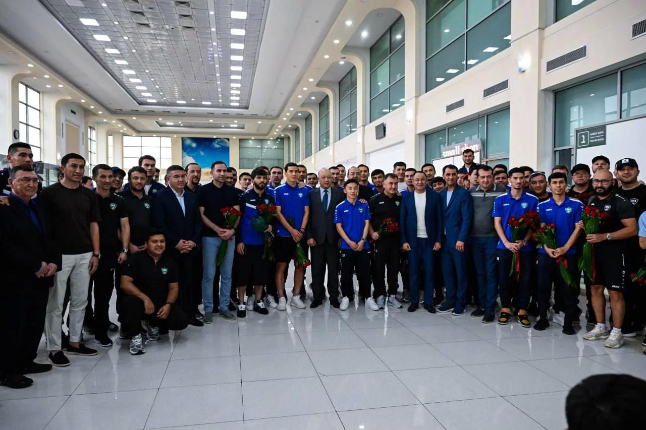 在首都塔什干机场,准备隆重的欢迎仪式。铺着红地毯、国旗飘扬,乌兹别克斯坦总理、足协主席等高级领导人热情地欢迎球员们载誉归来。