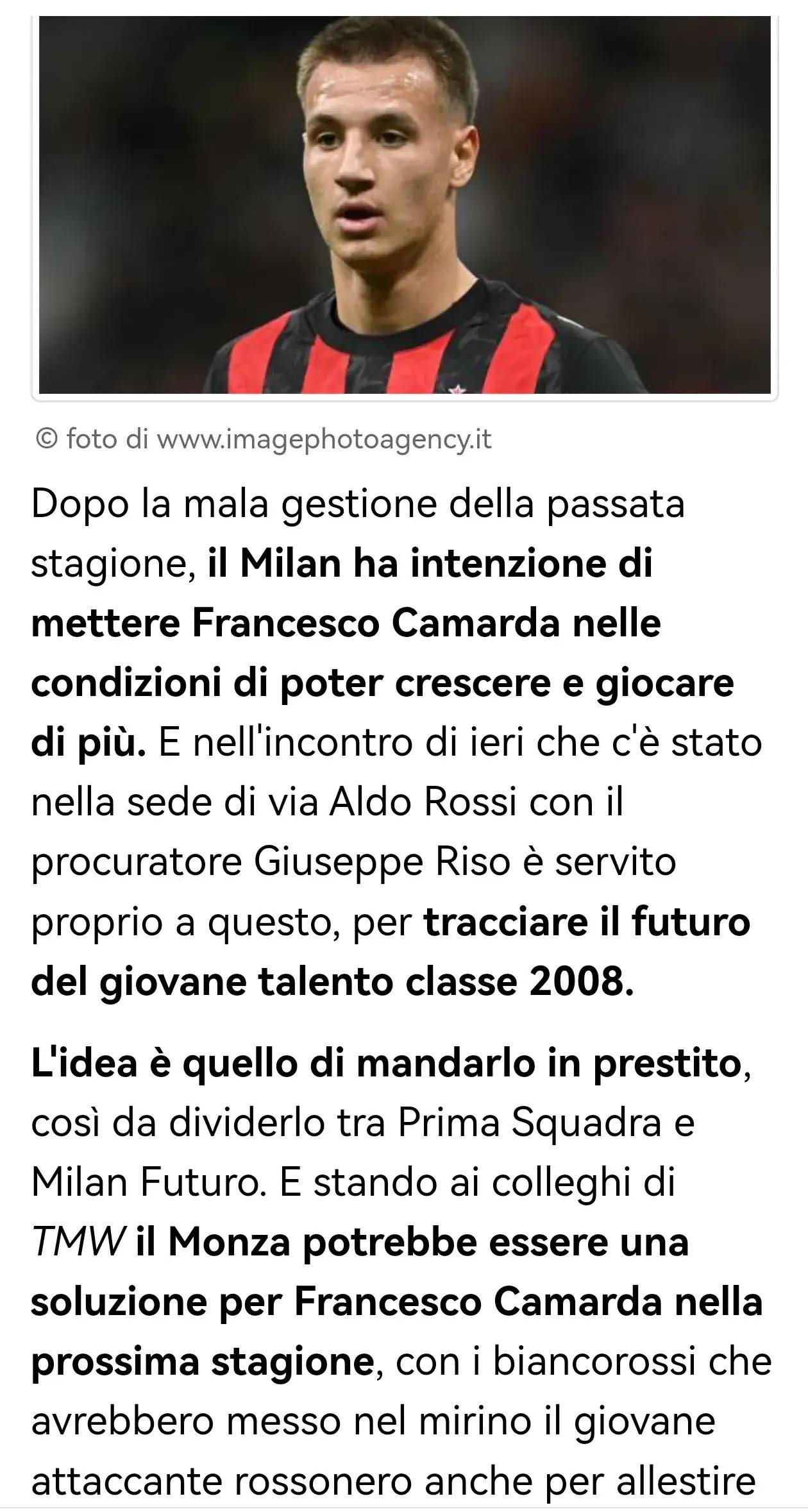 在经历上赛季的糟糕管理后,米兰计划为弗朗切斯科·卡马尔达创造更利于成长和获得更多出场机会的条件。昨日在阿尔多·罗西大道总部与俱乐部律师朱塞佩·里索的会面,正是为规划这位2008级天才小将的未来。