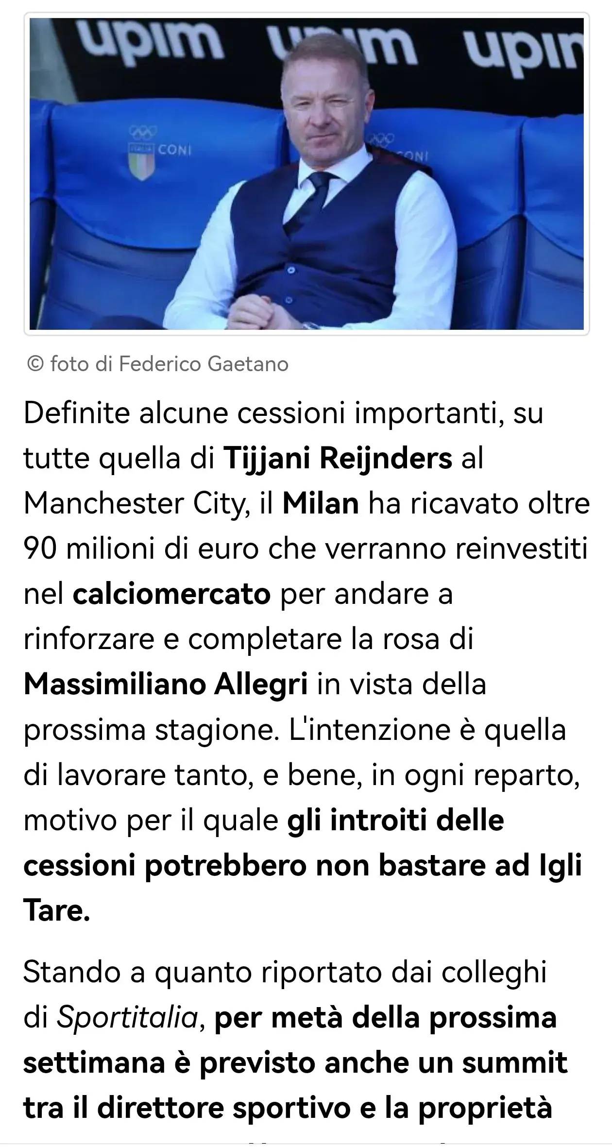 在完成几笔重要出售(尤其是蒂亚尼·赖因德斯转会曼城)后,米兰已套现超9000万欧元,这笔资金将重新投入转会市场,用于补强并完善马西米利亚诺·阿莱格里的下赛季阵容。体育总监伊格利·塔雷的目标是在各个位置全面发力,现有转会收入或许仍不敷使用。