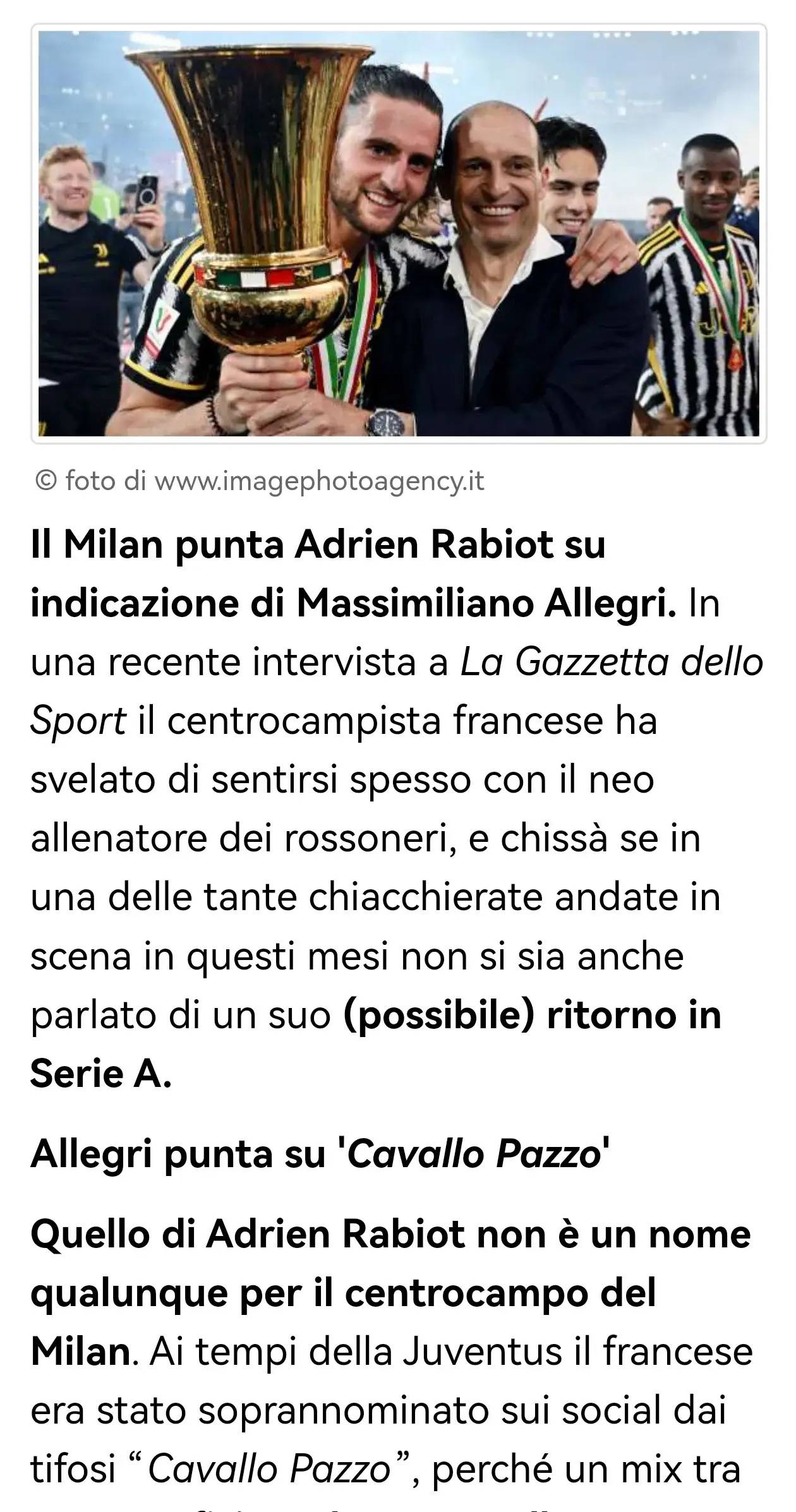 米兰正根据马西米利亚诺·阿莱格里的建议追逐阿德里安·拉比奥特。这位法国中场近期在接受《米兰体育报》采访时透露,常与红黑军团新帅交流——没人知道在过去数月的诸多对话中,是否也谈及他(可能)重返意甲的话题。