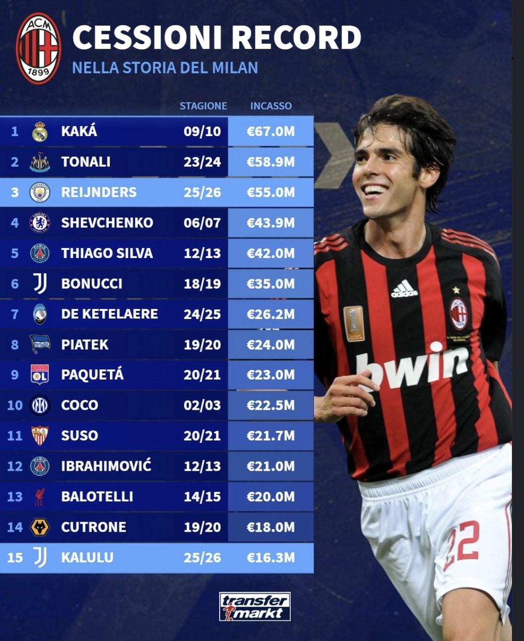 AC米兰队史出售球员身价Top15(只计算固定转会费):