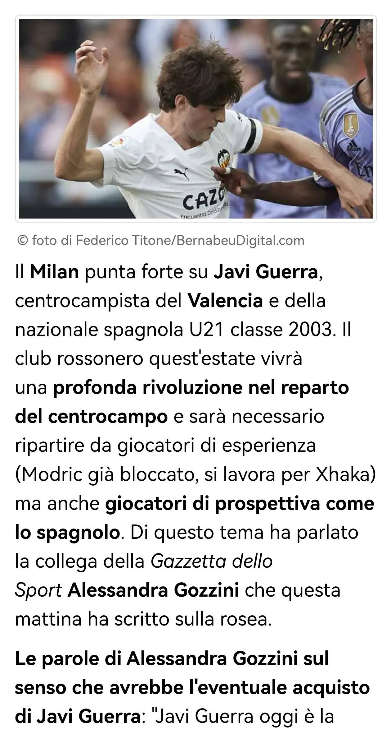 米兰俱乐部正全力追逐瓦伦西亚中场、2003年出生的西班牙U21国脚哈维·格拉(Javi Guerra)。红黑军团今夏将在中场进行深度革新,既要依靠经验型球员(已锁定莫德里奇,正推进扎卡交易),也要引入如格拉这样的潜力新星。《米兰体育报》记者亚历山德拉·戈齐尼今晨就此话题撰文分析。