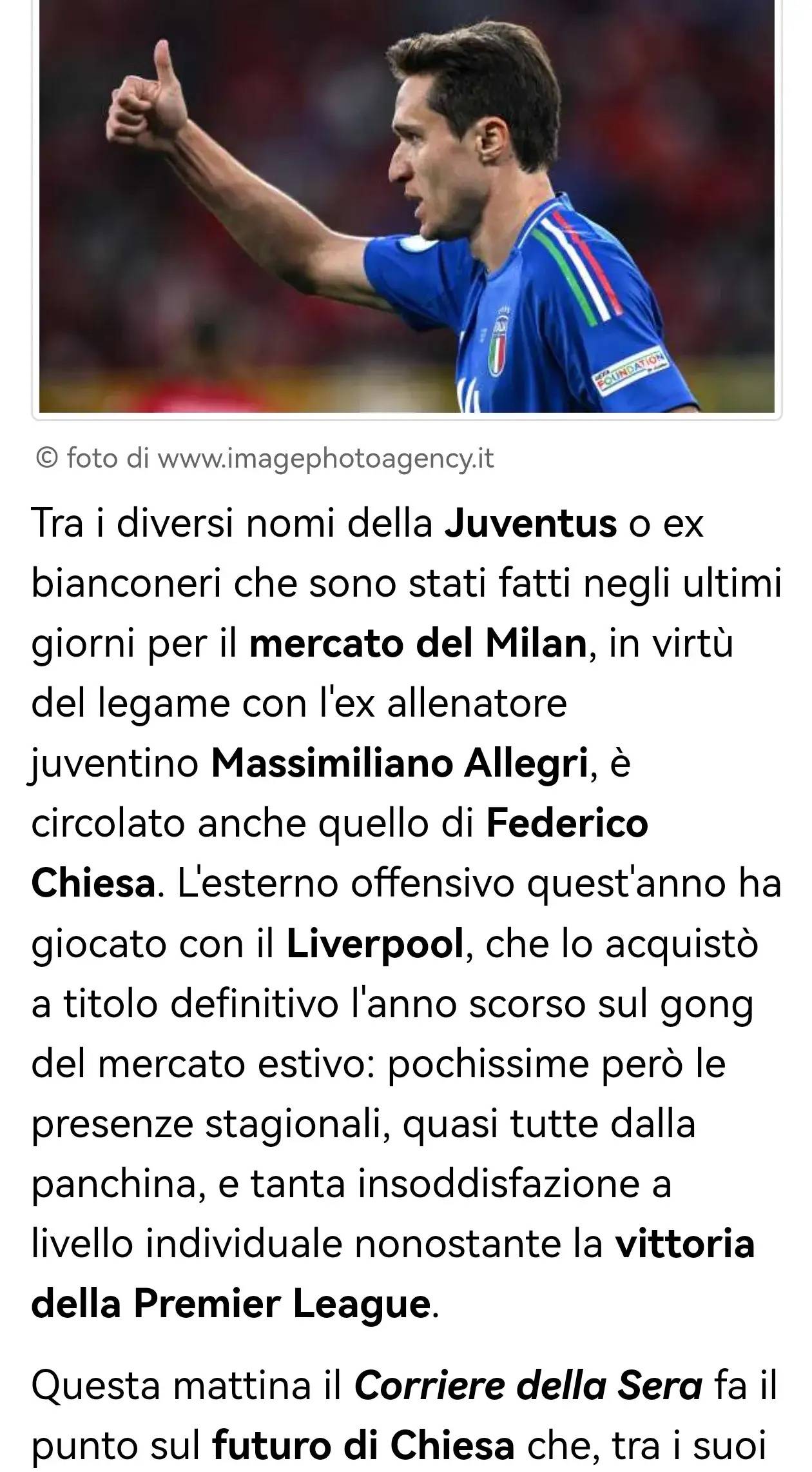 在过去几天里,由于与前尤文图斯主帅马西米利亚诺·阿莱格里的联系,费德里科·基耶萨的名字也出现在米兰转会传闻中。