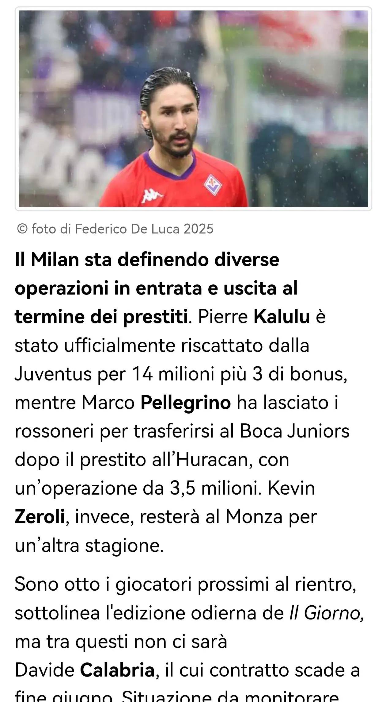 米兰正在敲定多笔租借到期球员的进出交易。皮埃尔·卡卢卢已被尤文图斯以1400万欧元基础转会费加300万欧元浮动奖金正式买断;