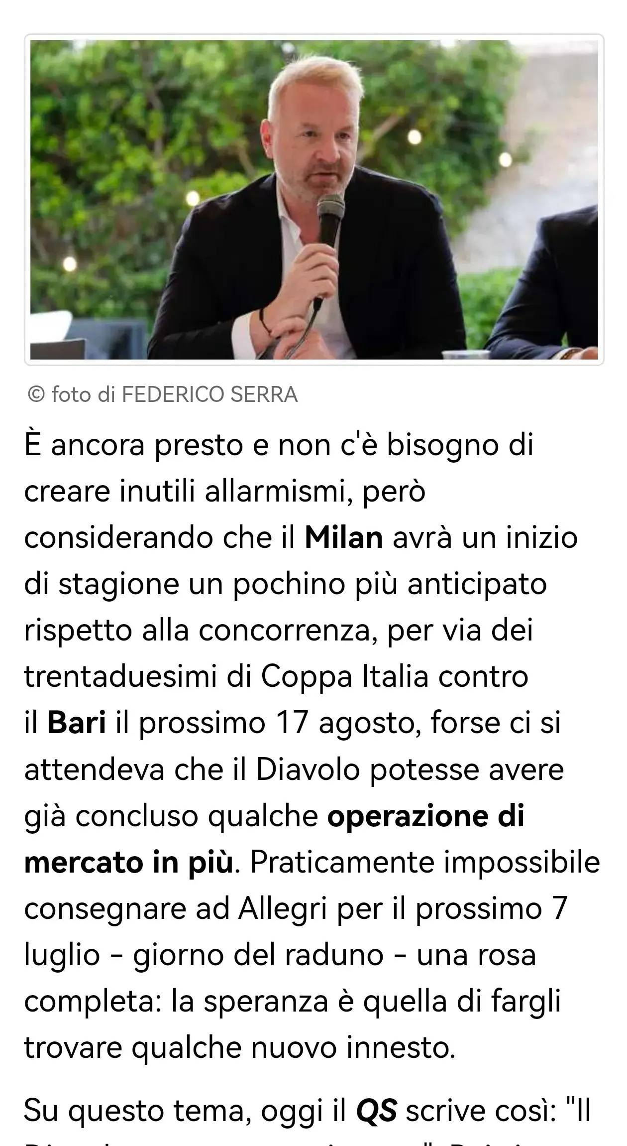 现在为时尚早,无需制造不必要的恐慌,但考虑到米兰的新赛季开局比竞争对手稍早——因为下赛季意大利杯首轮对阵巴里的比赛将在8月17日进行,外界或许期待红黑军团能更快完成几笔转会操作。