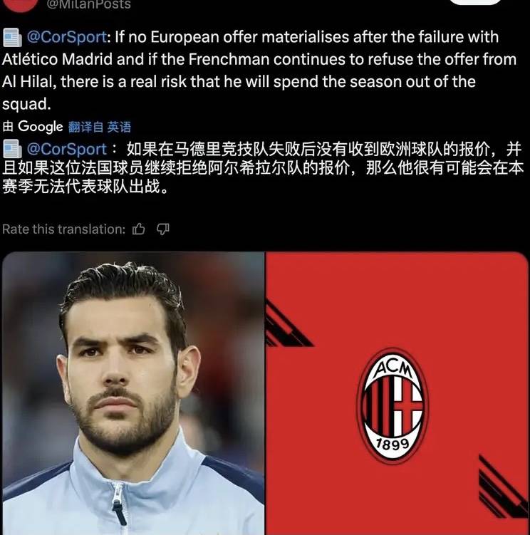 持续施压特奥!米兰持续施压特奥,米兰俱乐部管理层告知特奥经纪人马德里竞技的转会谈判已经失败,现在利雅得新月俱乐部的报价依然有效,特奥有两个选择,第一转会利雅得新月俱乐部,第二在转会窗口关闭前寻找到可以提供足够转会费的俱乐部,否则特奥将在看台履行他的最后一年合同。