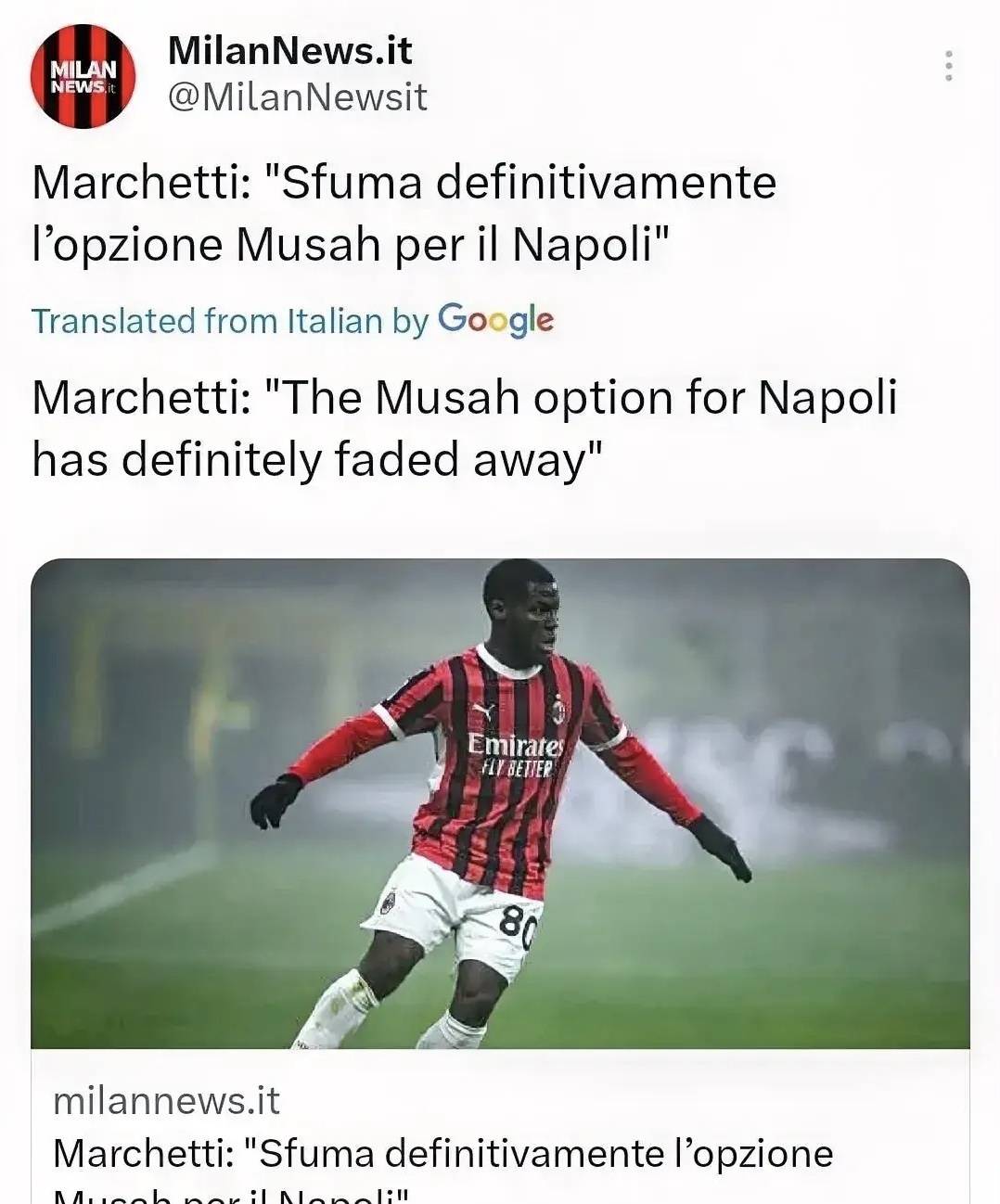 交易失败!那不勒斯俱乐部失去了对穆萨的兴趣,那不勒斯俱乐部认为米兰对穆萨的要价太高了,那不勒斯无法满足米兰俱乐部针对穆萨的转会费要求,交易基本宣告失败。