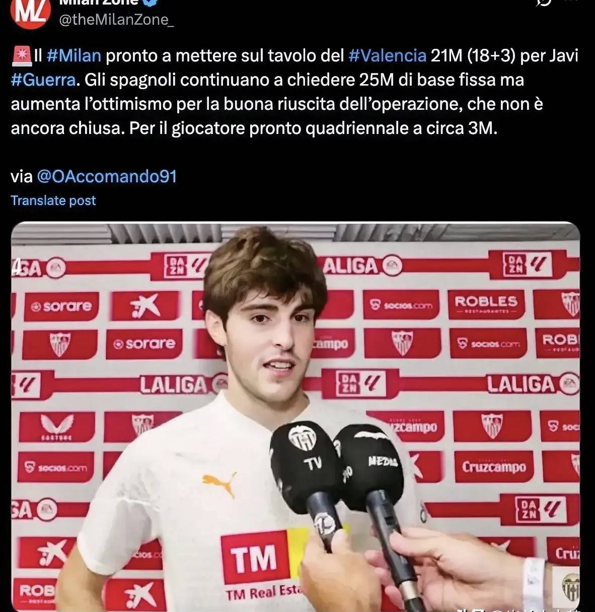 意甲媒体透露:瓦伦西亚对于哈维格拉的开价为2500万欧元,米兰首次报价为1800万欧元
