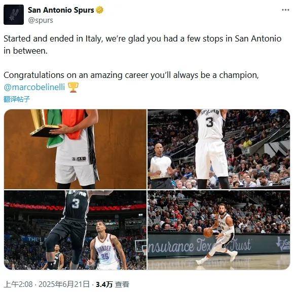 于是能看到在得知贝里内利退役的消息之后,马刺官推立刻为他送上祝福。贝里内利总共为马刺效力4个赛季,NBA生涯最后一站就是在马刺。