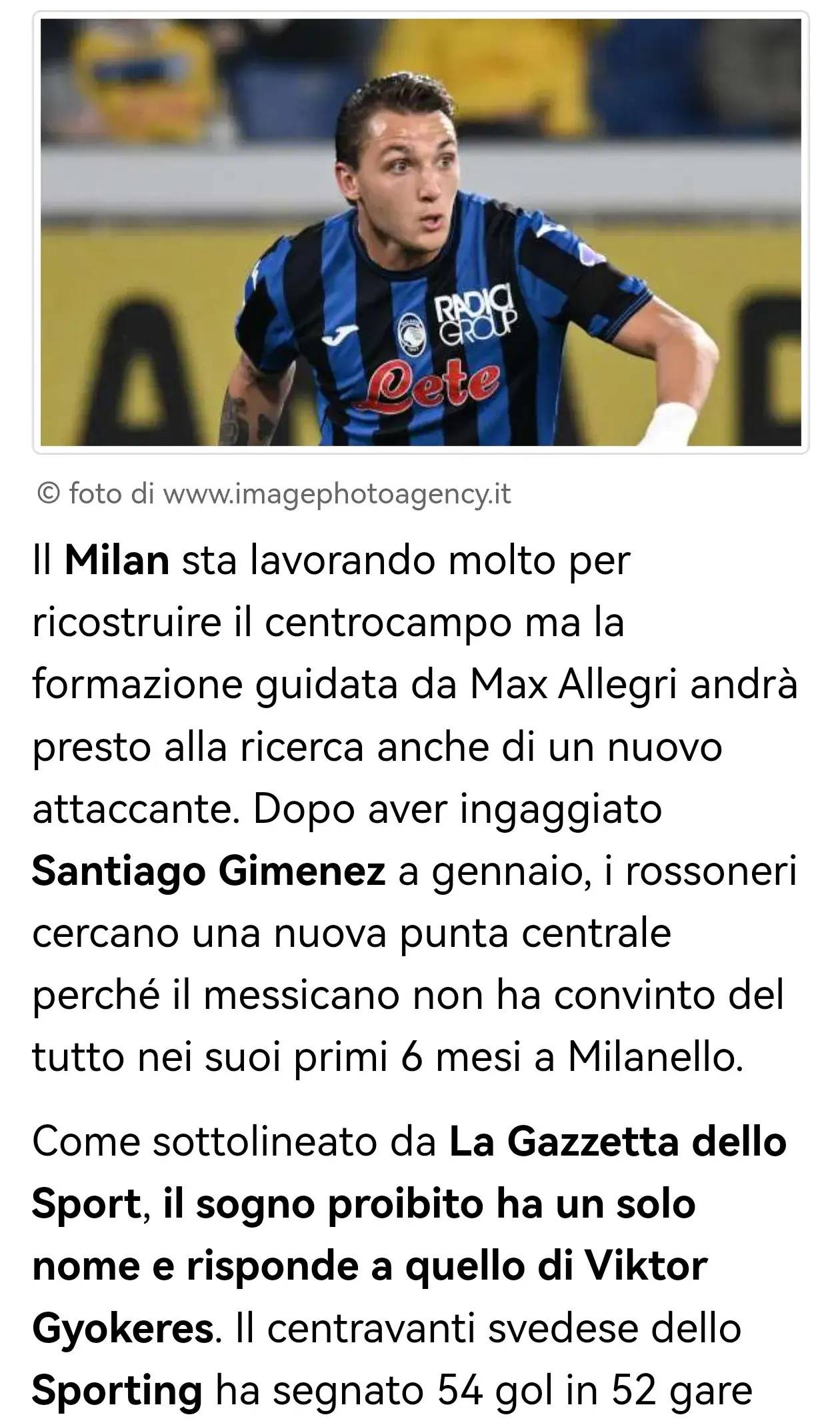 主要替代方案是亚特兰大的马泰奥·雷特吉,蓝黑军团对其要价约5000万欧元(可谈判),性价比更符合米兰预算。