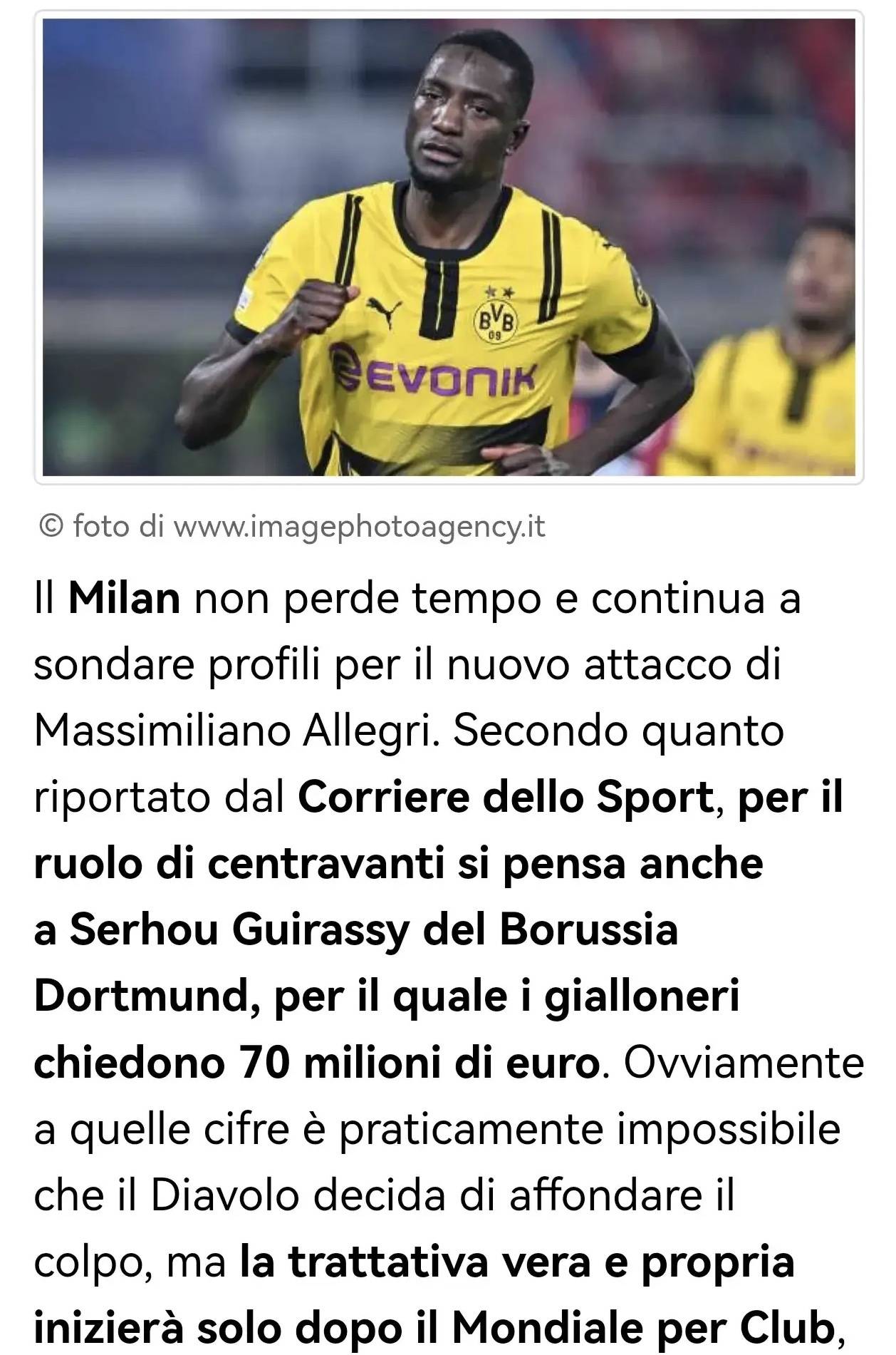 米兰马不停蹄地为马西米利亚诺·阿莱格里的新锋线考察人选。据《罗马体育报》报道,球队也在考虑多特蒙德前锋塞尔胡·吉拉西,黄黑军团对其标价7000万欧元。