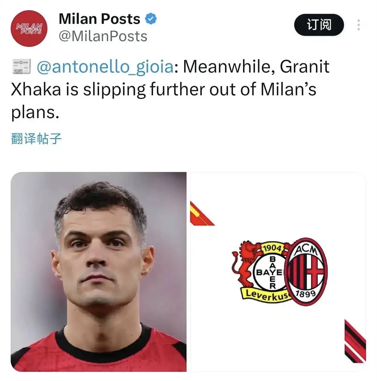 意甲媒体透露:米兰已告知勒沃库森俱乐部,扎卡的交易停止,双方差距太大