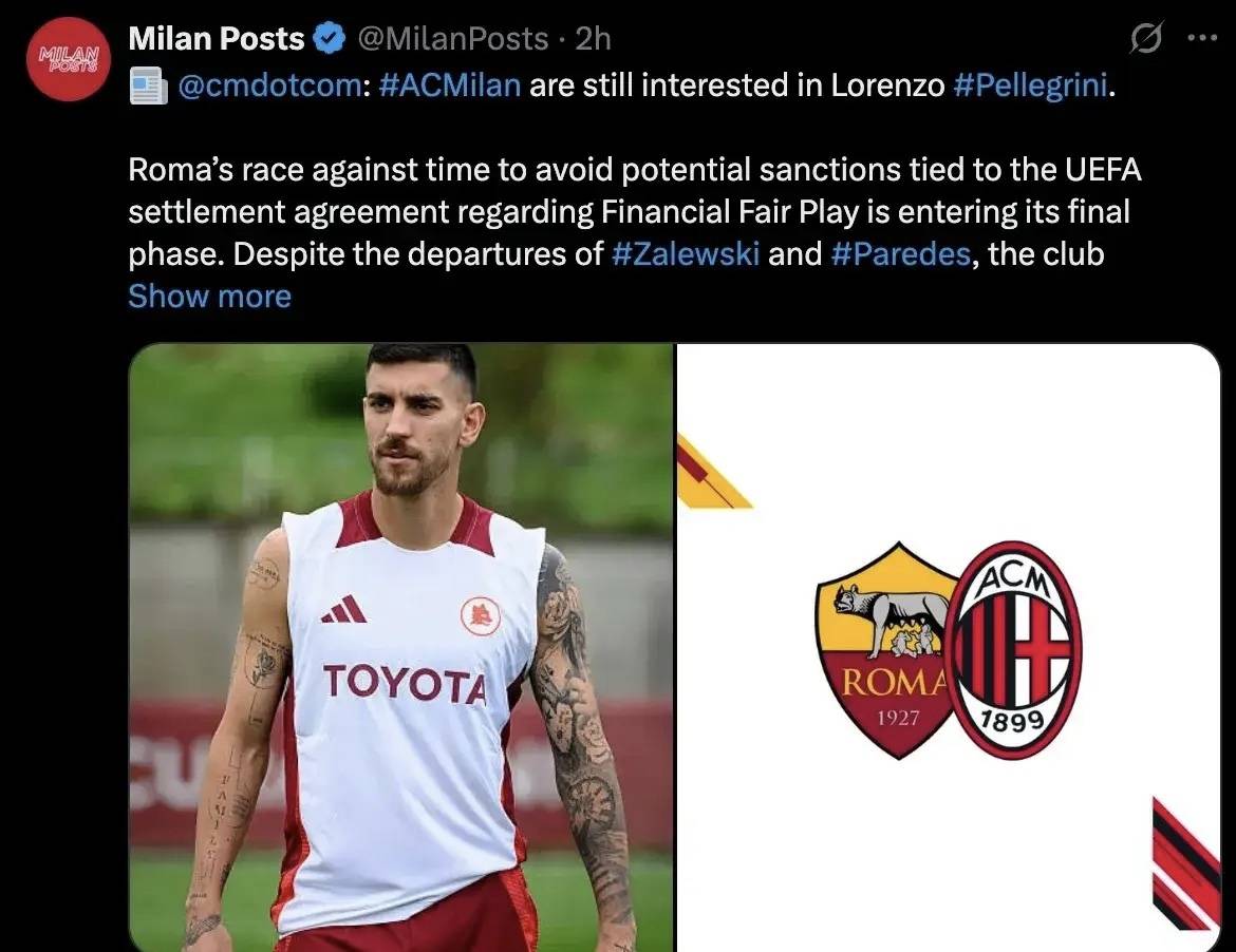 意甲媒体透露:米兰对罗马俱乐部中场球员佩莱格里尼感兴趣,有意今夏将其招入麾下