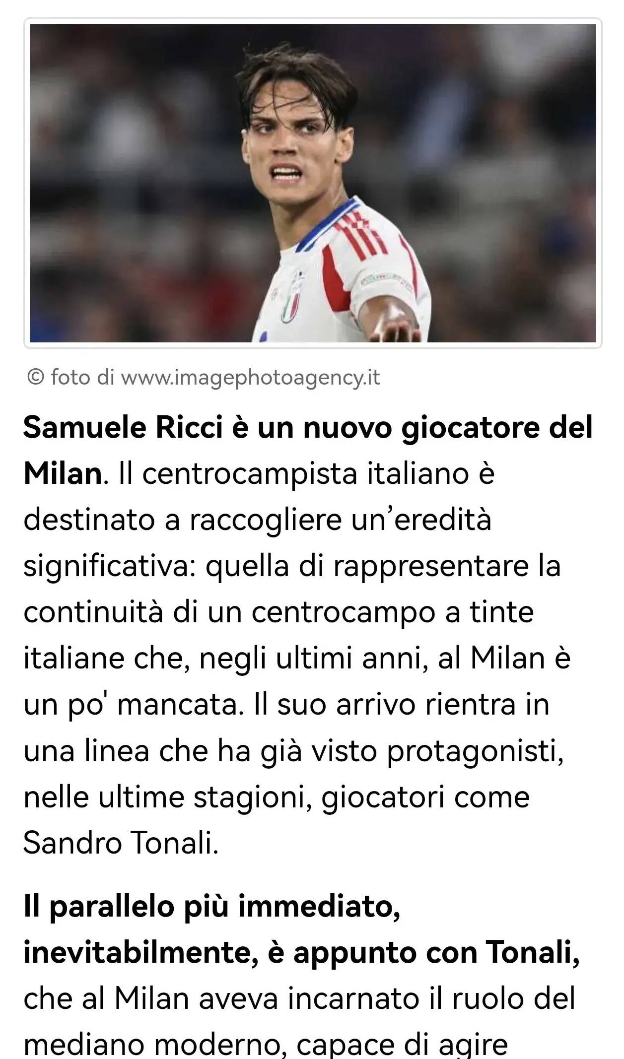 萨穆埃莱·里奇成为了米兰的新球员。这位意大利中场注定要继承一项重要的遗产:代表近年来米兰稍显缺失的意大利风格中场的延续性。他的加盟延续了过去几个赛季的路线,此前桑德罗·托纳利等球员便是这条路线的代表。