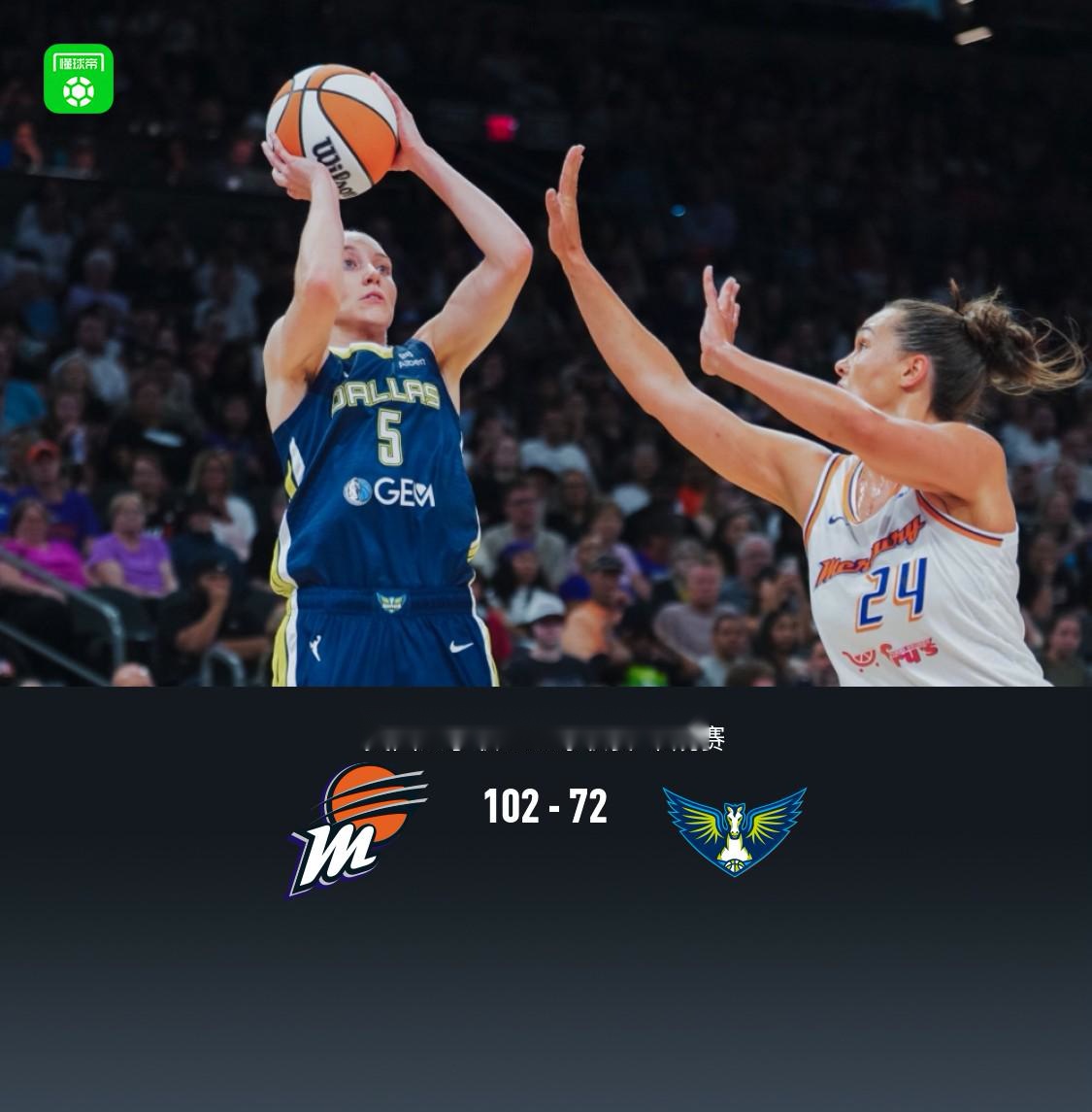 北京时间7月8日美国女子职业篮球联赛 常规赛,菲尼克斯水星对阵达拉斯飞翼。半场水星52-39飞翼,最终水星102-72飞翼。