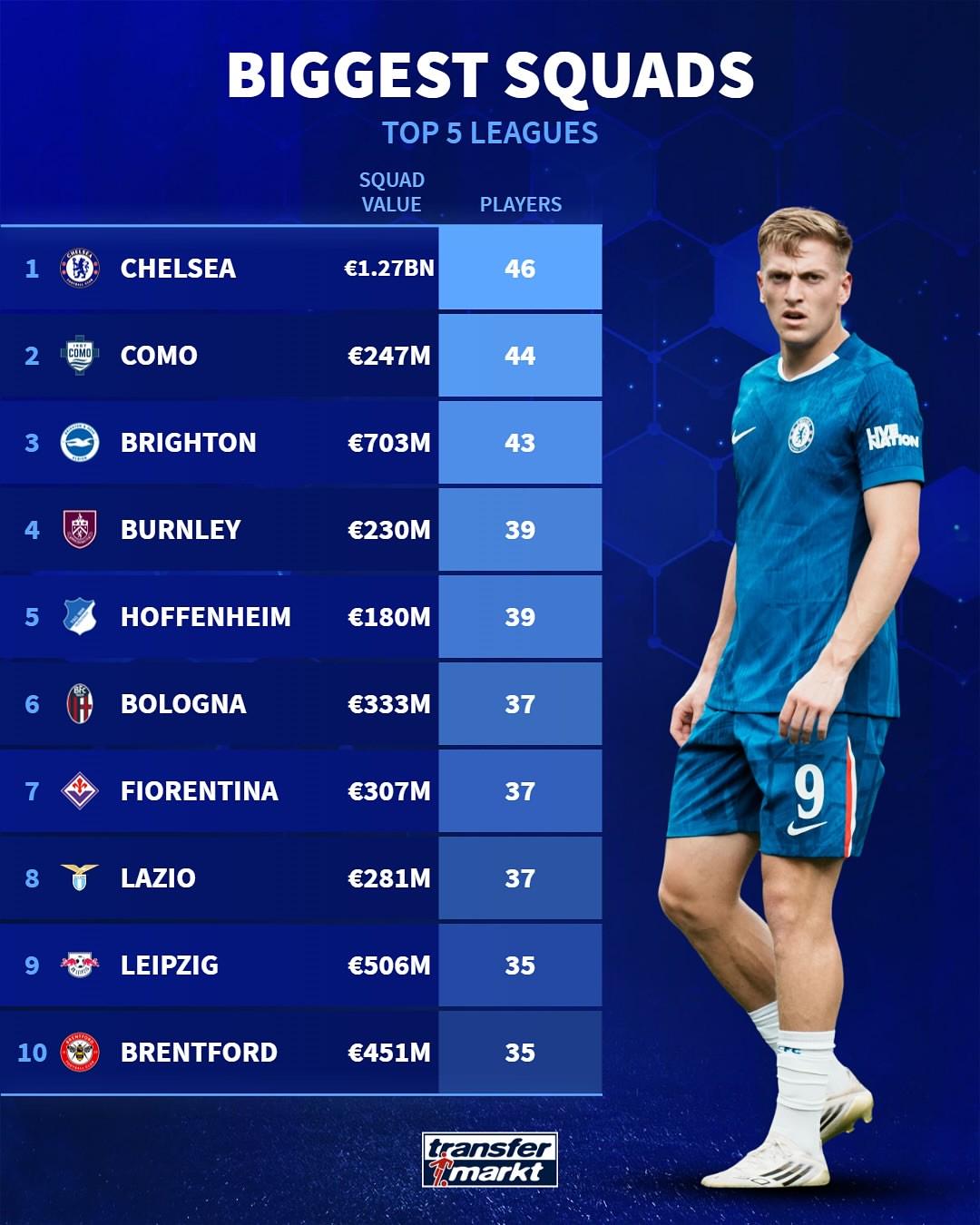 北京时间7月8日,德国转会市场盘点了迄今为止五大联赛中球员最多和最少的球队前十位,切尔西46人领跑球员最多球队榜单,科莫、布莱顿分居第二、第三位。