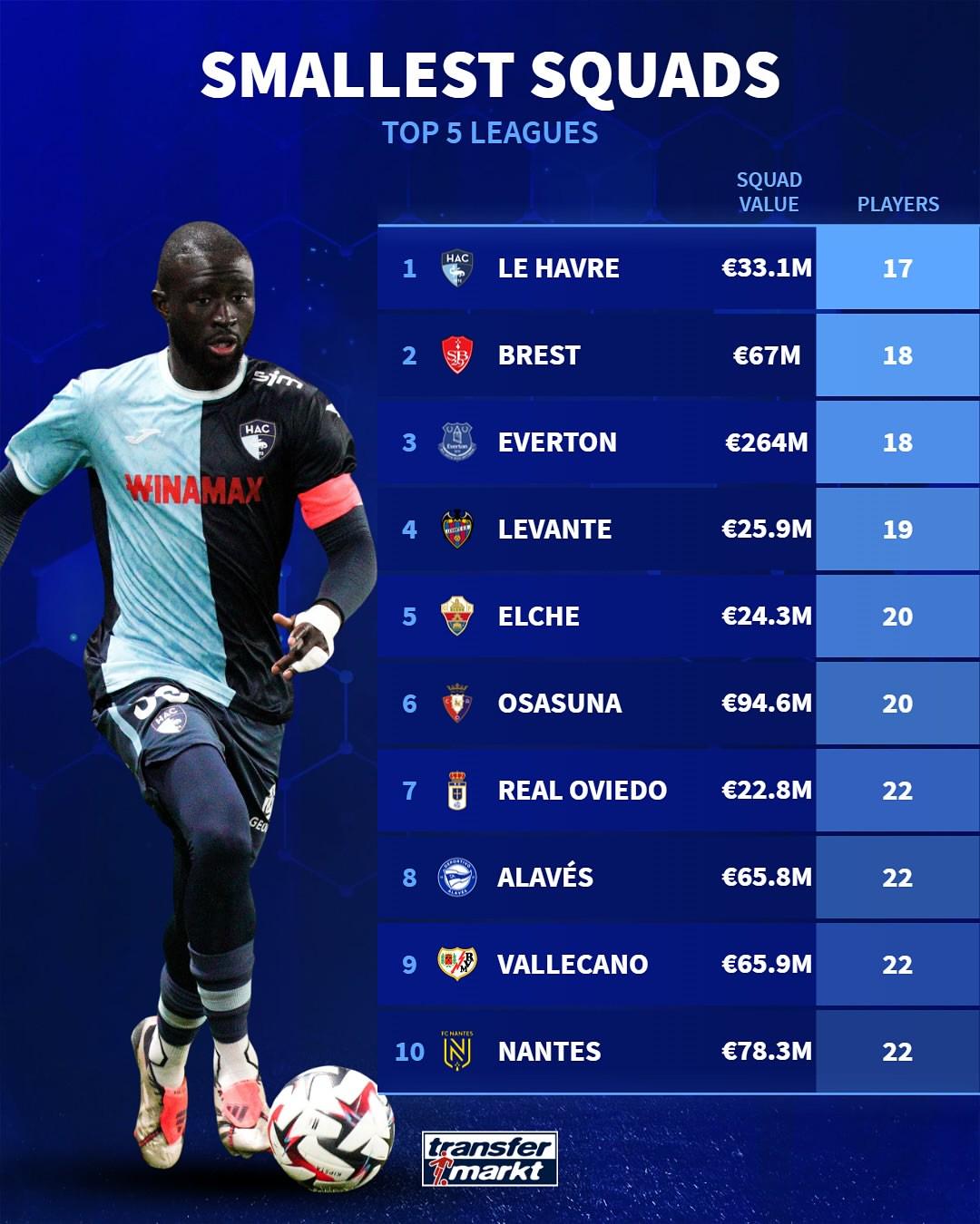 五大联赛迄今球员最多&最少球队榜单:切尔西46人领跑