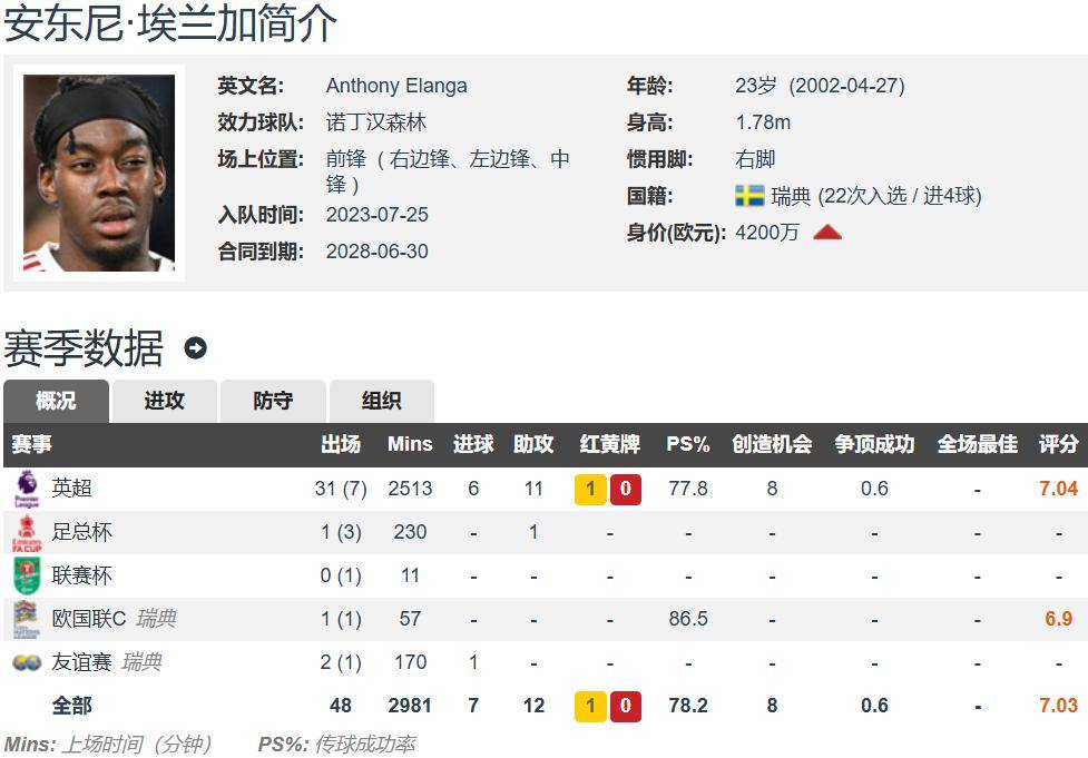 现年23岁的伊兰加,身高1.78米,右脚球员,主打右边锋位置,与诺丁汉森林的合同至2028年,德转估价4200万欧元。伊兰加上赛季各项赛事共为伊兰加出场43次,其中32次首发,贡献6球12助。
