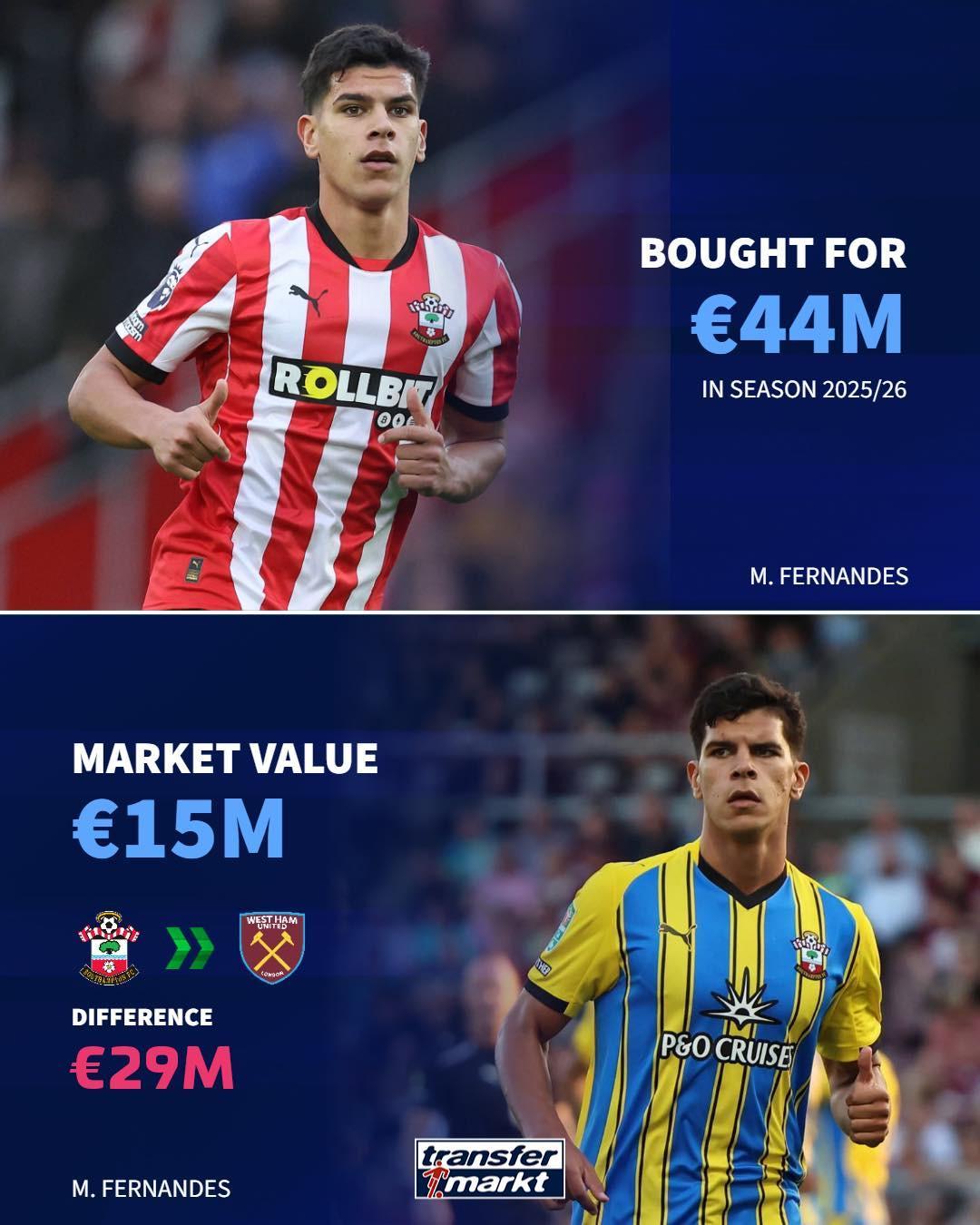 马特乌斯-费尔南德斯目前德转身价1500万欧,西汉姆联以4400万欧将他从南安普顿引进。上赛季他为南安普顿各项赛事出场42次,其中39次首发,贡献3粒进球并送出6次助攻。