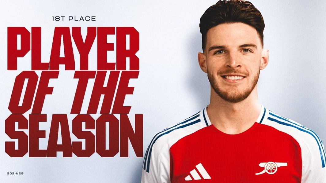 阿森纳官方宣布,赖斯被球迷们投票选为2024-25赛季阿森纳男足最佳球员。