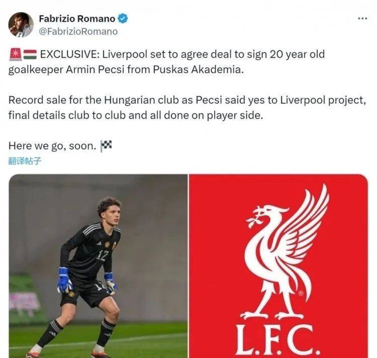 据罗马诺爆料,利物浦即将签下20岁的普斯卡什学院主力门将阿明-佩奇。目前,球员已经同意加盟,两家俱乐部正在敲定最终的细节问题,这笔交易将创造普斯卡什学院出售球员的历史纪录。本赛季,阿明-佩奇代表普斯卡什学院出战36场比赛,完成11次零封。
