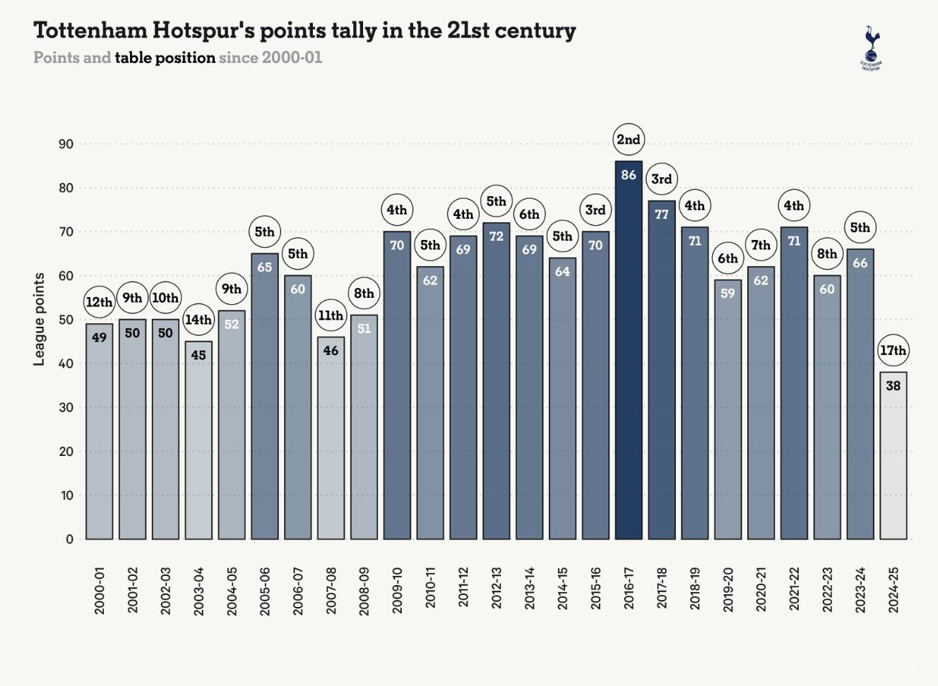 另一方认为他执教两个完整赛季仅获104分,输球场次(34)多于胜场(31)。自2023年11月1-4负切尔西后,66场仅78分,排除降级队后同期仅优于埃弗顿和狼队。这两个赛季的背景包括比赛风格转变、凯恩离队、孙兴慜状态下滑、伤病、阵容单薄、2024年夏窗引援偏好年轻球员(未签加拉格尔、拉姆齐或内托)。