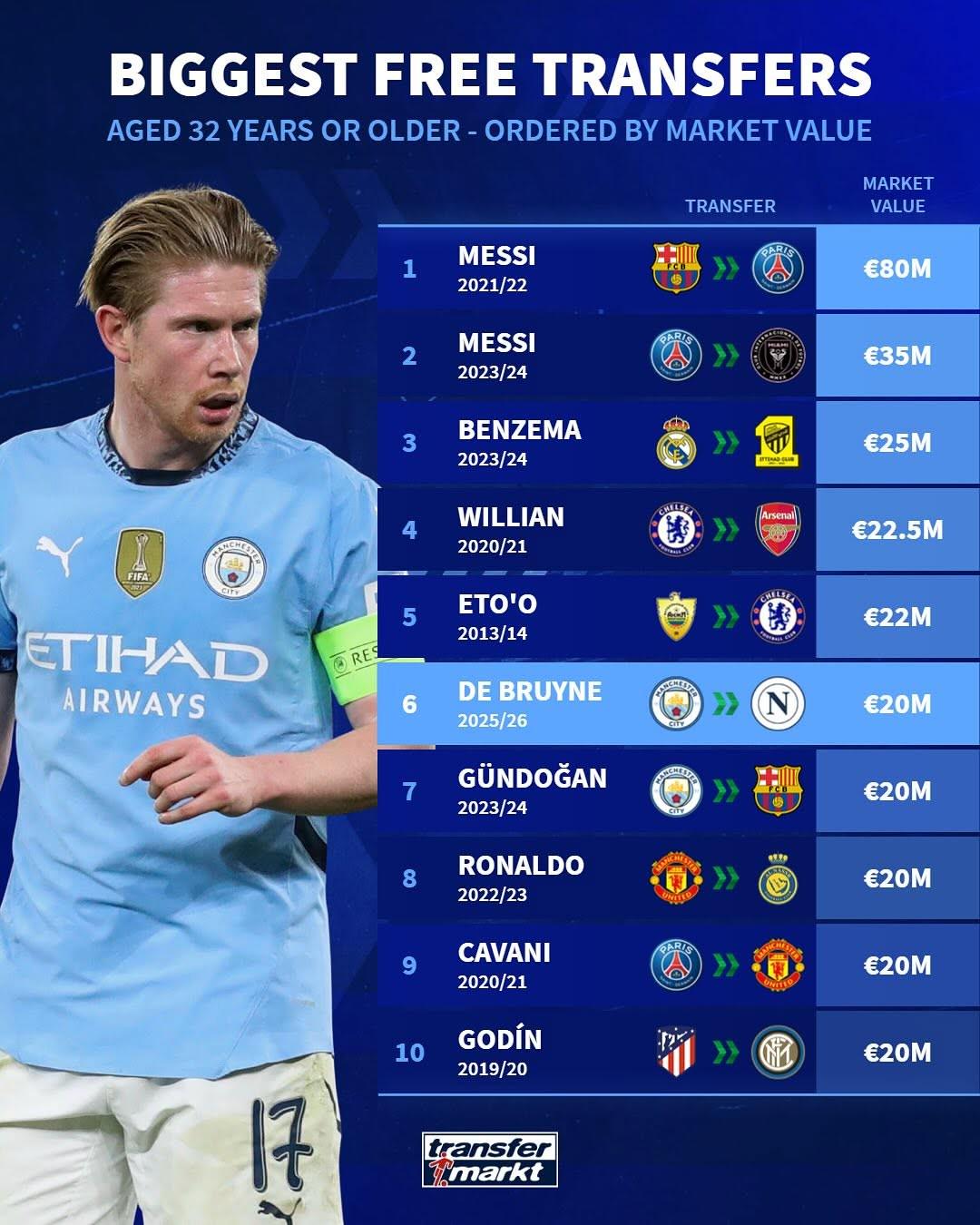北京时间6月12日,德转更新了“32岁及以上自由转会球员身价排行榜”,刚刚以自由身加盟那不勒斯的比利时球星德布劳内位列榜单第六,而榜单前两位由梅西占据。