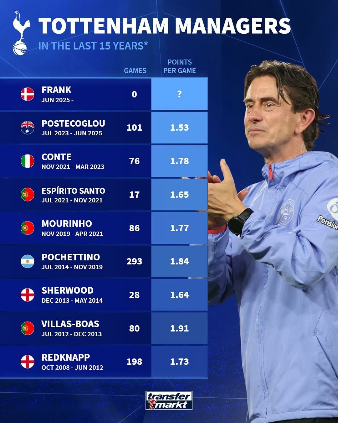 北京时间6月13日,据德转数据统计,在已执教热刺超过10场的主帅中,维拉斯-博阿斯以每场平均1.91分的成绩居首。