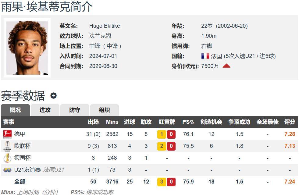 现年22岁的埃基蒂克到底有什么魔力吸引利物浦、切尔西、曼联进行争夺战?埃基蒂克身高1.90米,右脚中锋,德转估价7500万欧元,与法兰克福的合同至2029年,法兰克福并不着急出售,唯有高价才会套现。埃基蒂克上赛季各项赛事共为法兰克福出场48次,其中43次首发,打入了惊人的22个进球,还有12次助攻,算是能传能射的中锋。