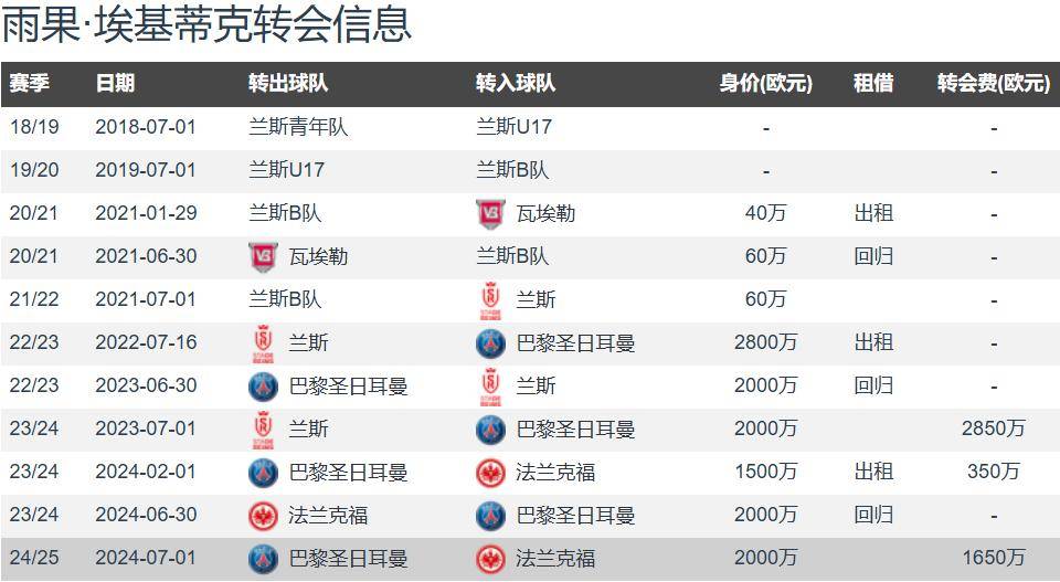 埃基蒂克出自兰斯青训,球员于2023年夏窗以2850万欧元的转会费加盟巴黎,但没有踢出来,并外租至法兰克福效力,球员于2024年夏窗以1650万欧元的低价转投法兰克福,并在法兰克福的重点培养之下,一个赛季就成功造星。