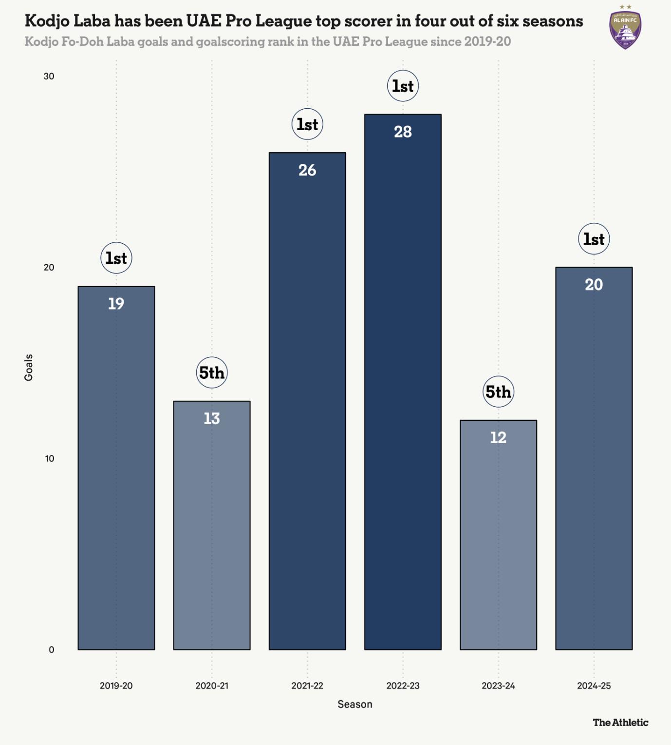 在阿尔艾因效力期间,拉巴在129场联赛中攻入118球,这样的进球率足以与世俱杯上的一些顶级球星媲美,包括梅西和哈兰德。