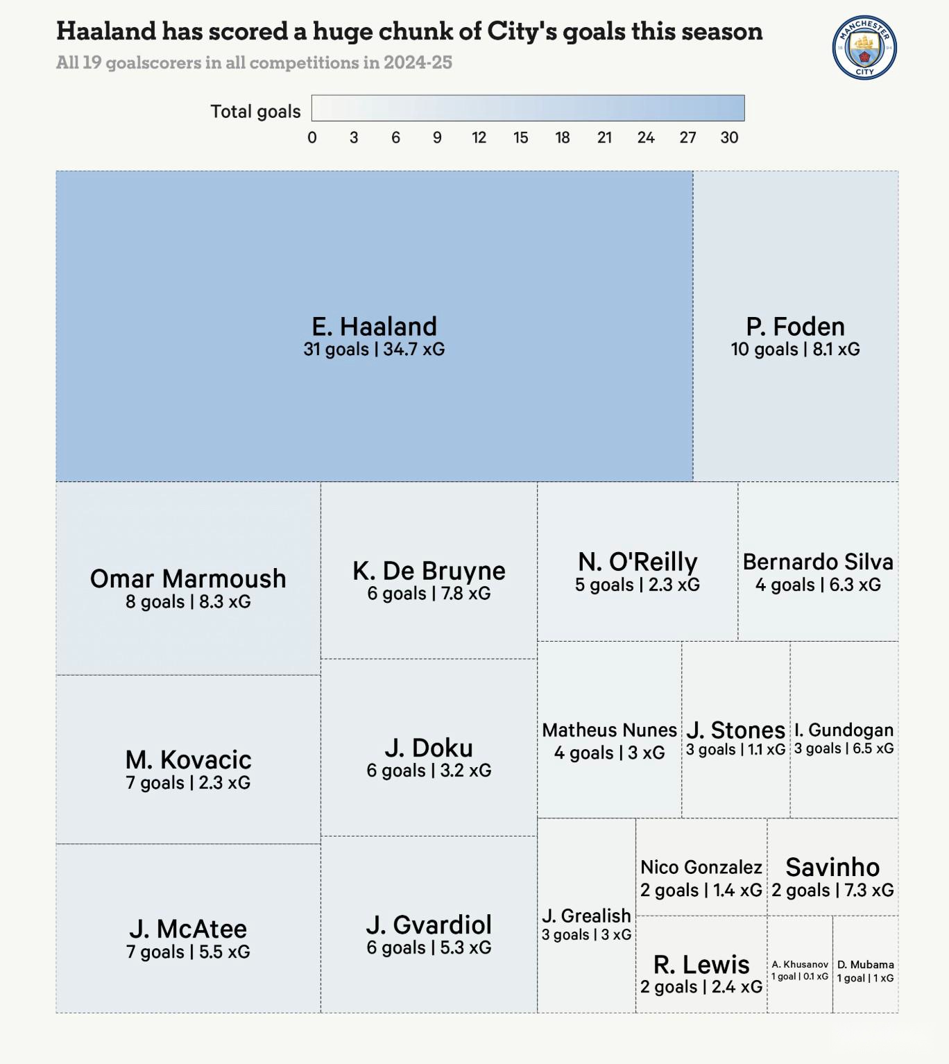 这位挪威前锋在英超处子赛季出战53场打入52球——其中英超单赛季进球高达36个,打破了历史纪录。尽管他的进球数据略有下滑,但他仍承担着曼城大部分的进球任务。