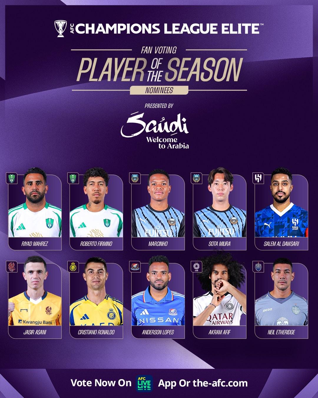 北京时间6月13日,亚冠官方公布了本赛季亚冠精英联赛最佳球员的候选名单,C罗领衔,马赫雷斯、菲尔米诺在列。