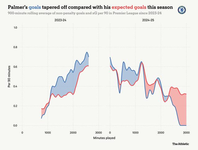 单看基础数据还算乐观:帕尔默在2024-25赛季英超贡献15球8助攻。与2023-24赛季的22球相比下滑,主要是因为本赛季点球机会减少了4次,其中1次罚失。