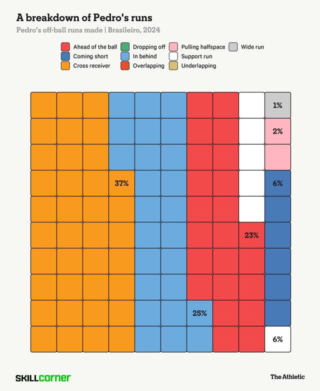 SkillCorner的无球跑动数据进一步印证了这种比较:他的绝大多数移动都旨在冲击禁区、撕裂防线、通过牵制防守为队友创造空间。