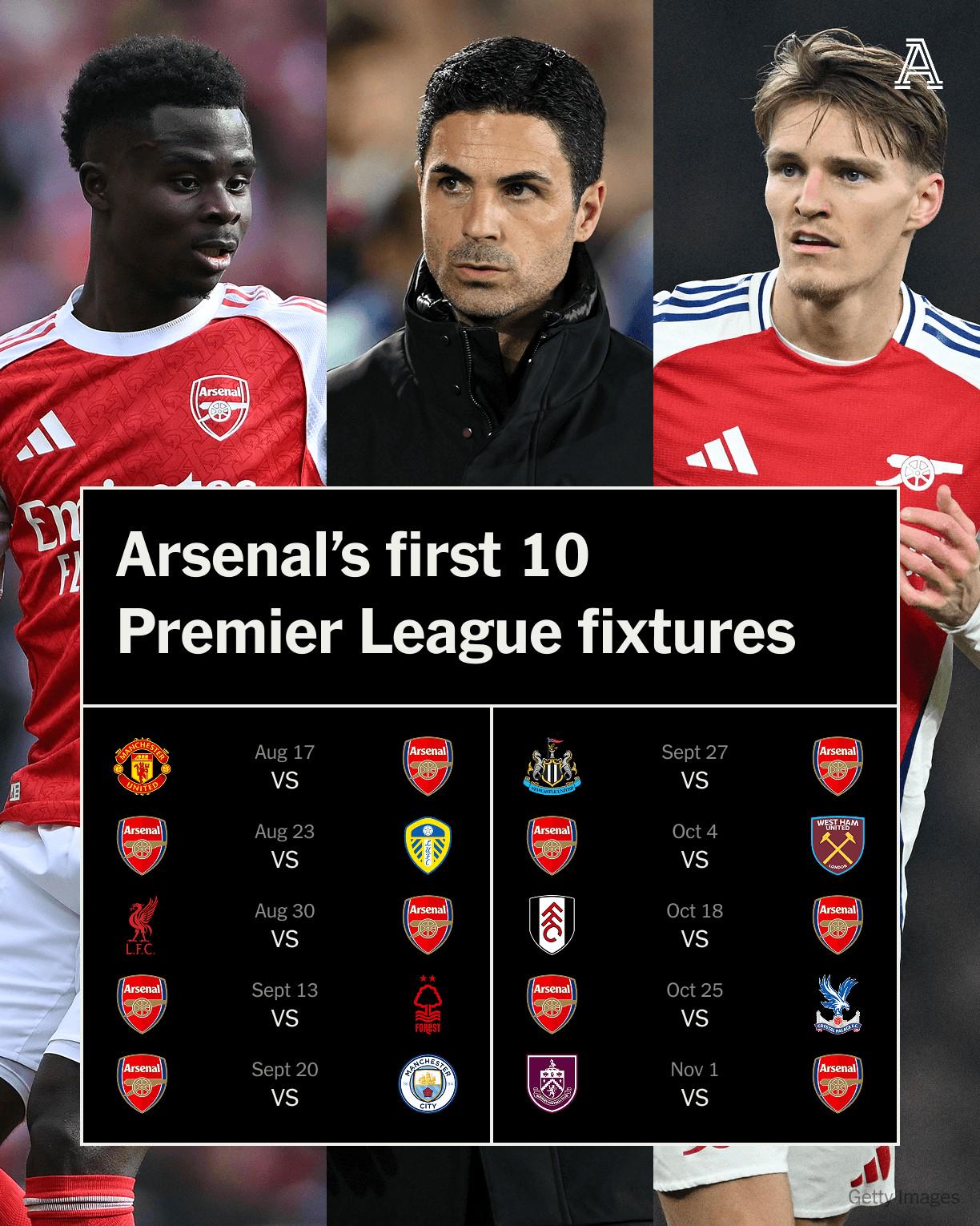 在多次获得亚军后,阿森纳本赛季的目标是联赛冠军。但首轮做客老特拉福德以及第三轮客场挑战利物浦,将带来严峻的即时挑战,可能导致阿尔特塔的球队早早落后。主场迎战利兹联、诺丁汉森林和曼城,也将提供不同风格的考验,检验阿森纳的决心。