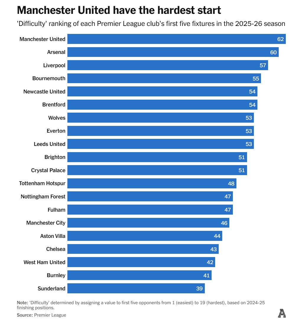 TA评25-26赛季英超开局赛程难度榜:曼联最凶险,桑德兰最轻松
