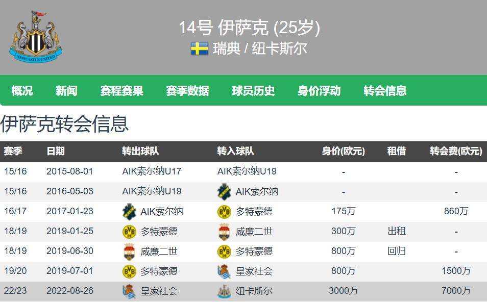 现年25岁的伊萨克,身高1.92米,右脚技术流中锋,与纽卡斯尔的合同至2028年,德转估价1.2亿欧元。伊萨克上赛季出战了34场英超的比赛,贡献23球6助,是上赛季的英超银靴。