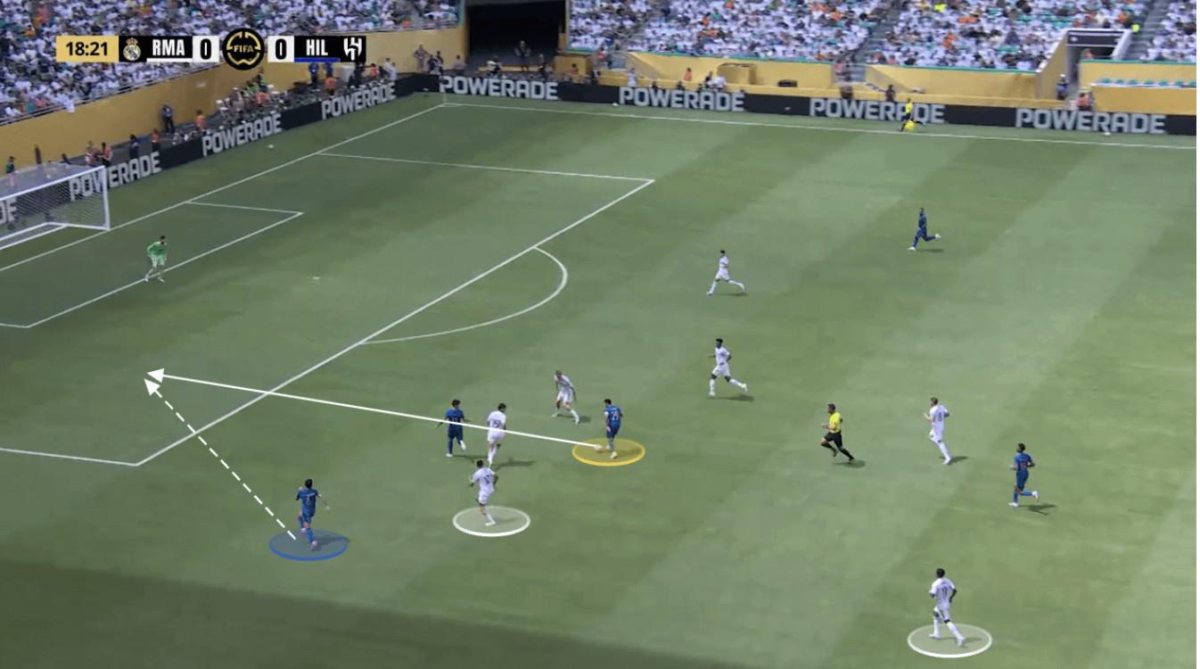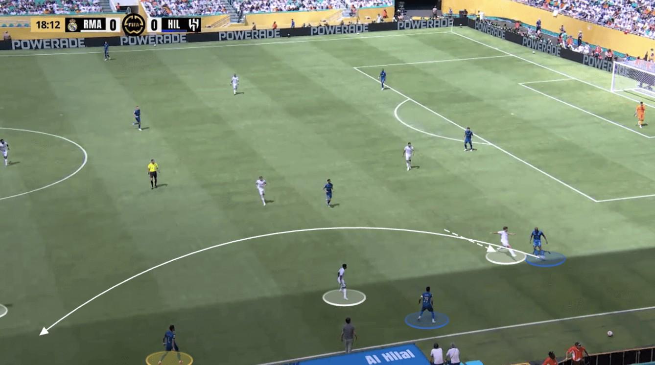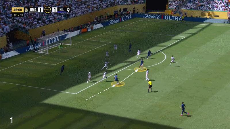 第三次险情源于新月后腰内维斯的特殊站位:他游弋至左后卫区域,而洛迪则前压。当门将布努准备长传时,皇马右边锋卜拉欣-迪亚斯的选位令人费解——或许是为避免加西亚单独面对库利巴利和内维斯。