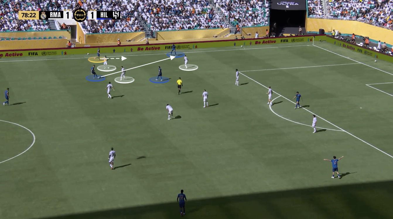 另一回合中,新月左路通过换位制造杀机。起初阿诺德、巴尔韦德和罗德里戈的站位尚属合理。