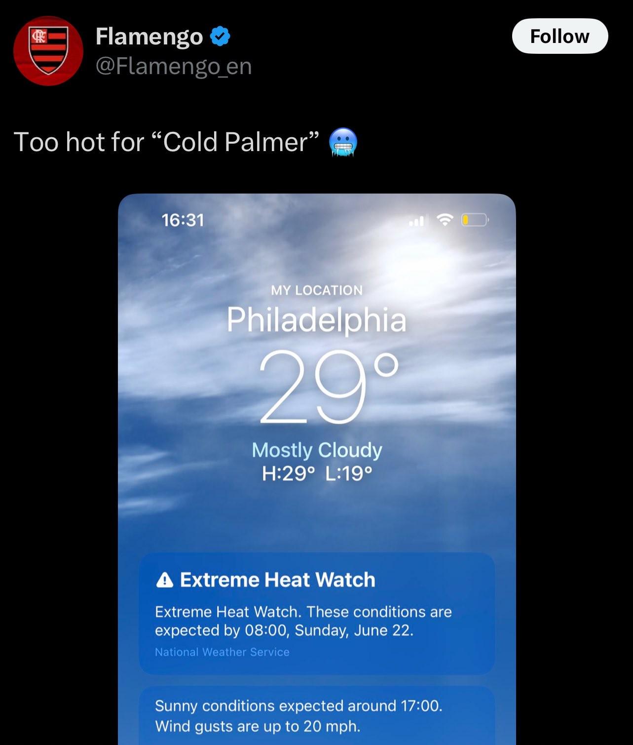 贴文写道: 这里对“冷酷的帕尔默”来说太热了。 并附上了费城的天气和温度状况截图。不过,目前该贴文已被弗拉门戈俱乐部删除。