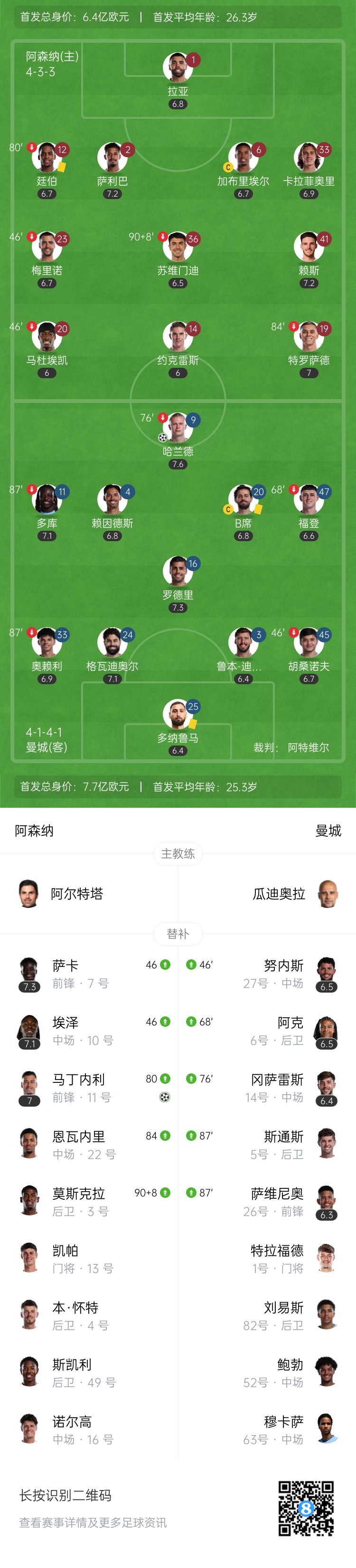 下半场伤停补时7分钟,全场比赛结束,最终阿森纳1-1曼城。