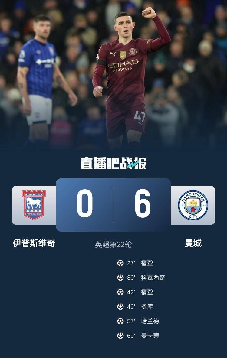 第69分钟,科瓦西奇送出斜传,麦卡蒂头球攻门得手,曼城6-0伊普斯维奇。↓