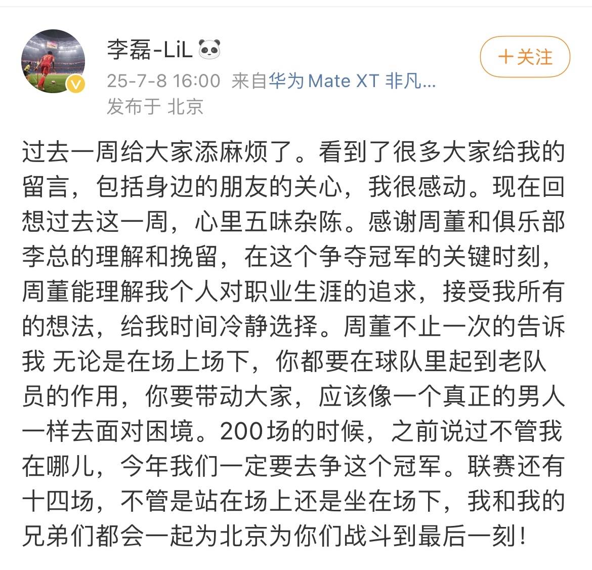 近段时间,李磊和河南队连续在了一起,一度启动了转会谈判,在国安边缘化,让他不甘心作为替补,想要能够踢上球,很多国安球迷感到惋惜,不希望李磊转会。7月8日,李磊发文自宣留队,不走了,让球迷悬着心可以放下了。他表示:“无论是场上还是场下,会和兄弟们一起为北京为你们战斗到最后一刻”。李磊为国安出场超过200场,这一纪录还会持续。