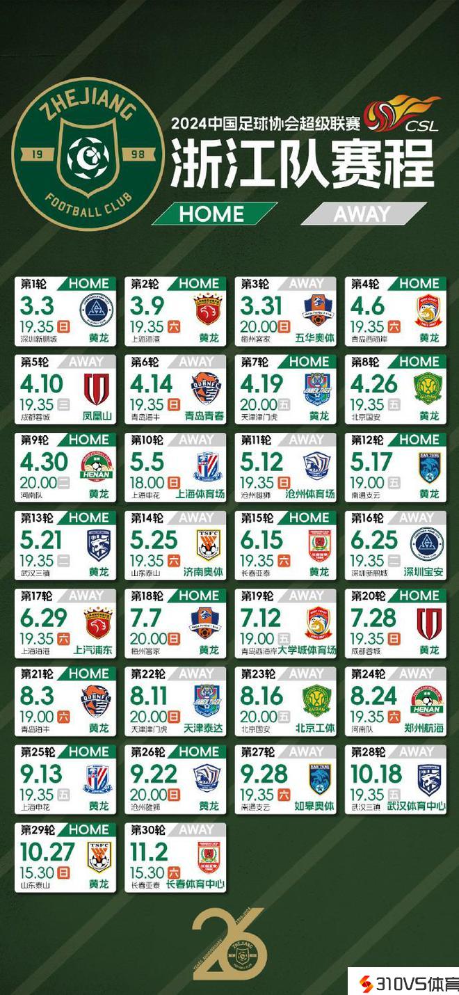 浙江队新赛季中超赛程:重回黄龙首战深圳新鹏城;末轮战长春