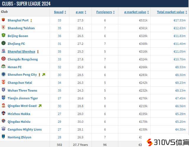 中超球队身价排名