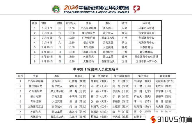 国际级主哨开幕战!中甲首轮8场裁判发布,杜健鑫执法广西对江西