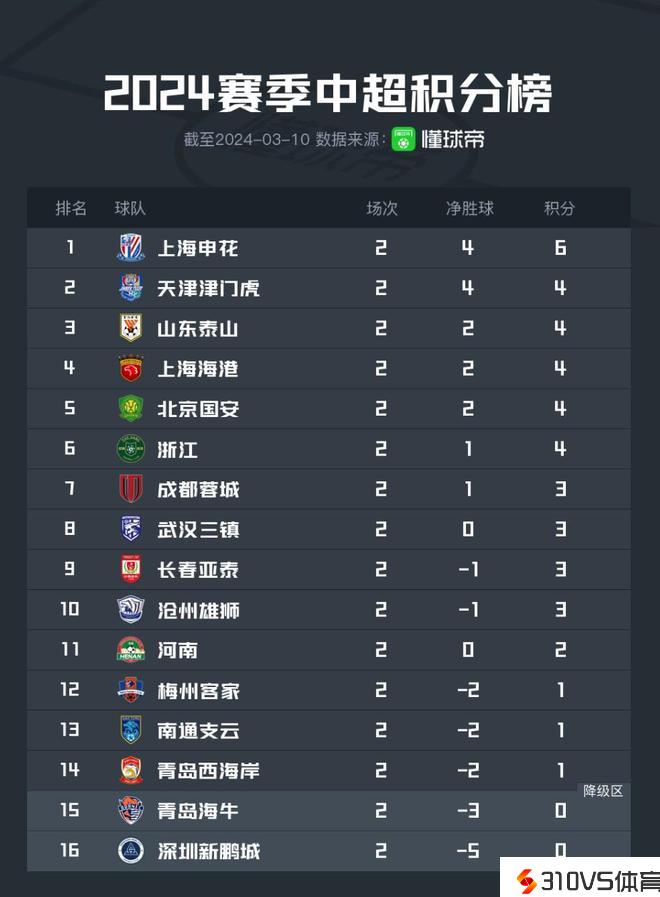 中超最新积分榜:申花两战全胜6分领跑,海牛、新鹏城0分