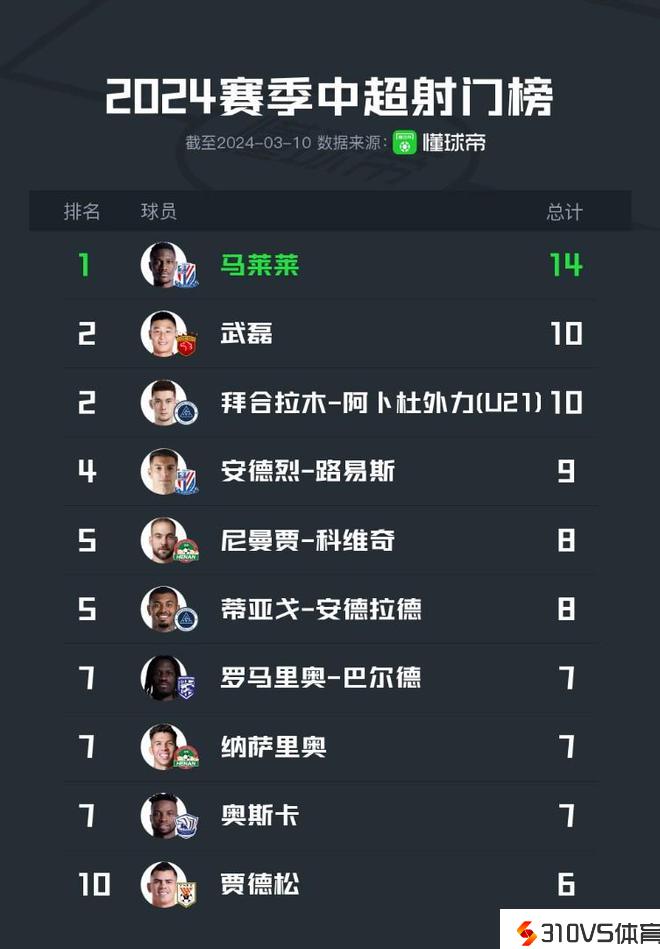 中超最新球员射门榜:马莱莱14次居首,武磊、拜合拉木各10次