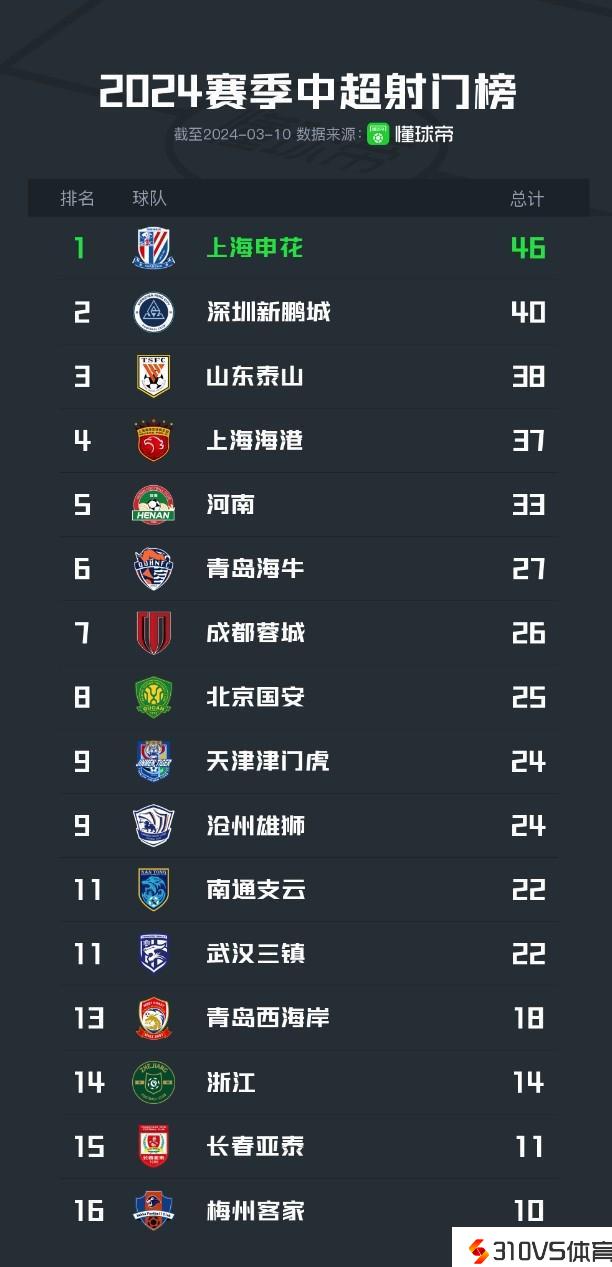 中超射门榜:领头羊申花46次居首,副班长新鹏城40次第二